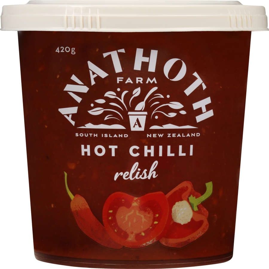 Anathoth Farm Hot Chilli Relish - Anathoth Farm use only quality produce for all their chutneys, pickles and relishes and make them nice and chunky with lots of quality fruit and vegetables and just the right amount of spices. Just like you would make yourself if you had time. Anathoth Farm chutneys, pickles and relishes are gluten free and preservative free.