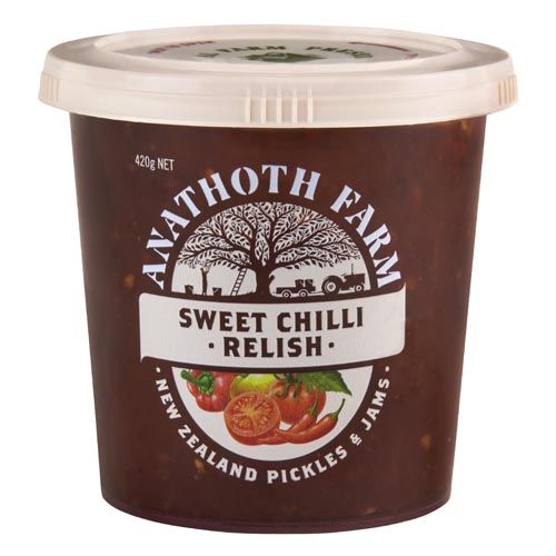 Anathoth Farm Sweet Chilli Relish - Anathoth Farm use only quality produce for all their chutneys, pickles and relishes and make them nice and chunky with lots of quality fruit and vegetables and just the right amount of spices. Just like you would make yourself if you had time. Anathoth Farm chutneys, pickles and relishes are gluten free and preservative free.