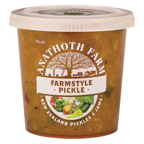 Anathoth Farmstyle Pickle contains NZ cauliflower, zucchini, red peppers, green peppers and onions. It is gluten free with no added preservatives, colours or flavours. Made in New Zealand.