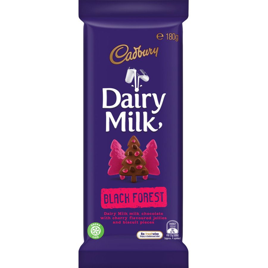 Cadbury Chocolate Block Black Forest - Cadbury dairy milk milk chocolate with raspberry jellies and biscuits pieces.