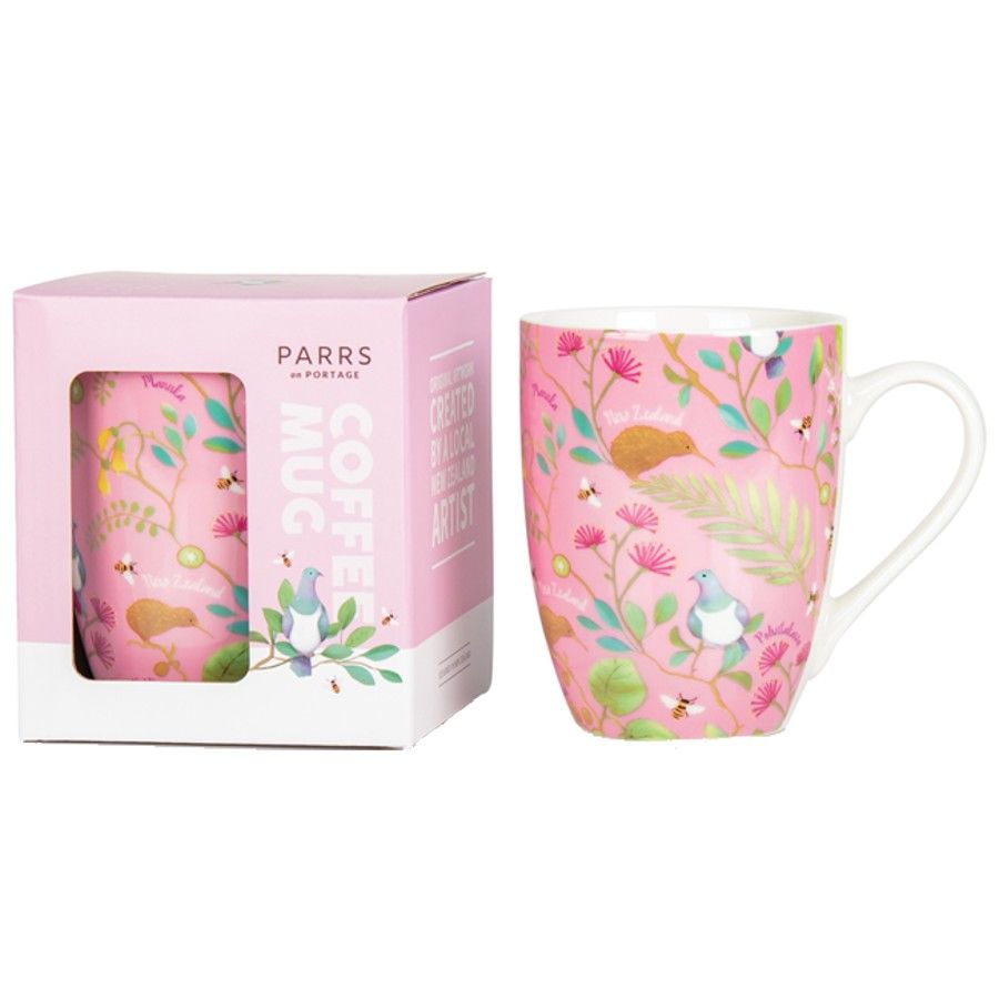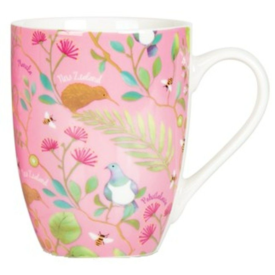 Coffee Mug NZ Birds and Flowers Pink - featuring gorgeous original artwork depicting New Zealand's unique flora and fauna.