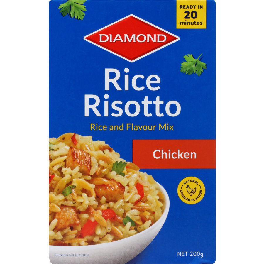 Diamond Rice Risotto Chicken -Â Chicken rice risotto is so tasty with its delicious blend of rice, risone pasta, capsicum, herbs and savoury chicken flavour. Enjoy rice risotto on its own or add your favourite ingredients for a creative main-size meal that's made in just 20 minutes. Perfect taste everytime.
