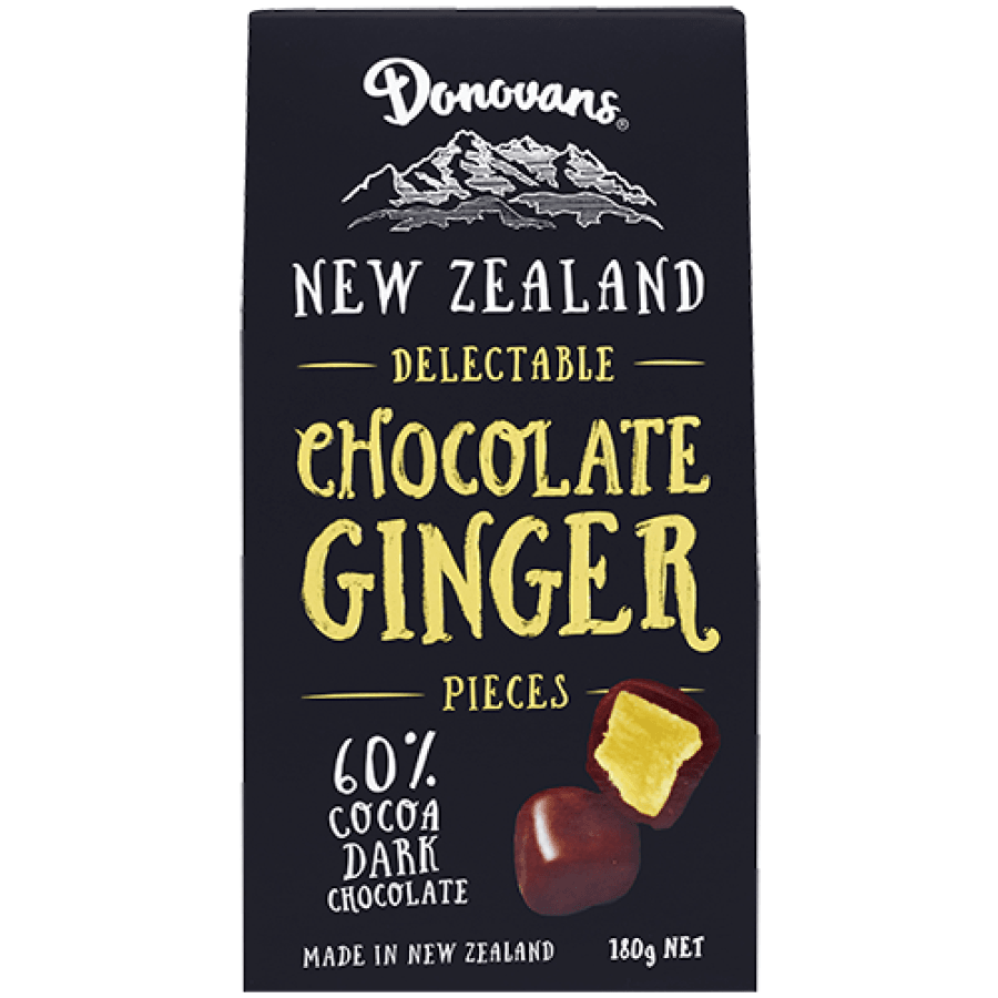 Donovans Dark Chocolate Ginger. Diced root ginger covered in dark chocolate . Donovans Chocolates blend single origin pure cocoa with natural vanilla and sugar to create an excellent balance between bitter and sweet in a classic dark chocolate. Hand selected pieces of diced whole root ginger are matched with this dark chocolate to create a ginger lovers delight that will send your taste buds dancing.