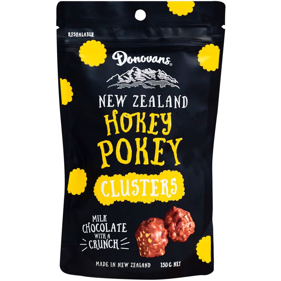 Donovans Hokey Pokey Clusters. Milk chocolate combined with delicious hokey pokey pieces in bite sized clusters. Available in a 150g re-sealable pouch.