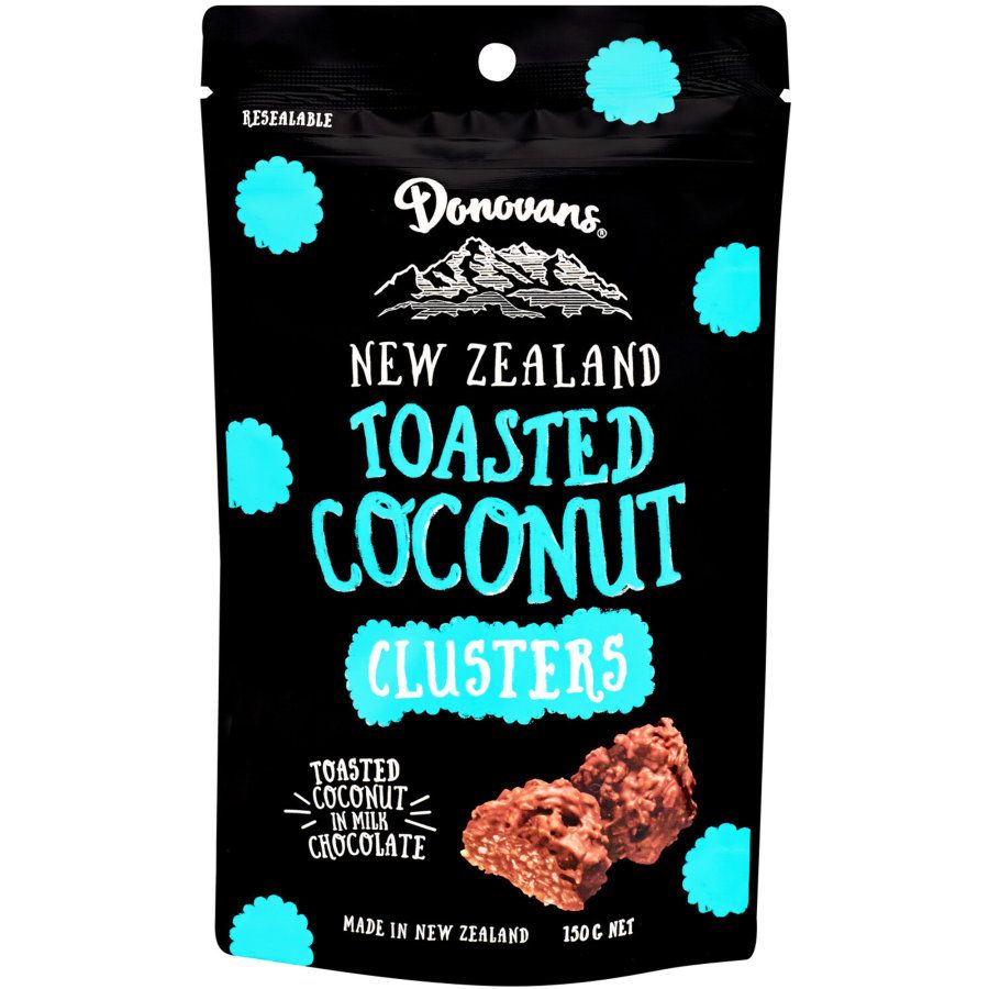 Donovans Toasted Coconut Clusters. Delicious Donovans 35% Milk Chocolate combined with indulgent toasted coconut thread. Available in a 150g re-sealable pouch.