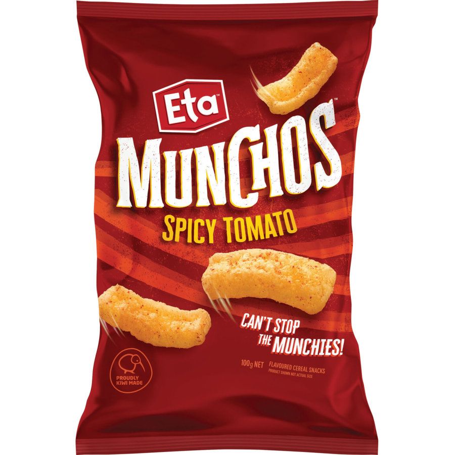 Eta Munchos Spicy Tomato - Can't stop the munchies. Surprise your tastebuds with a full on mouth crackling explosion. Grab a pack, rip into it and satisfy your munchies.