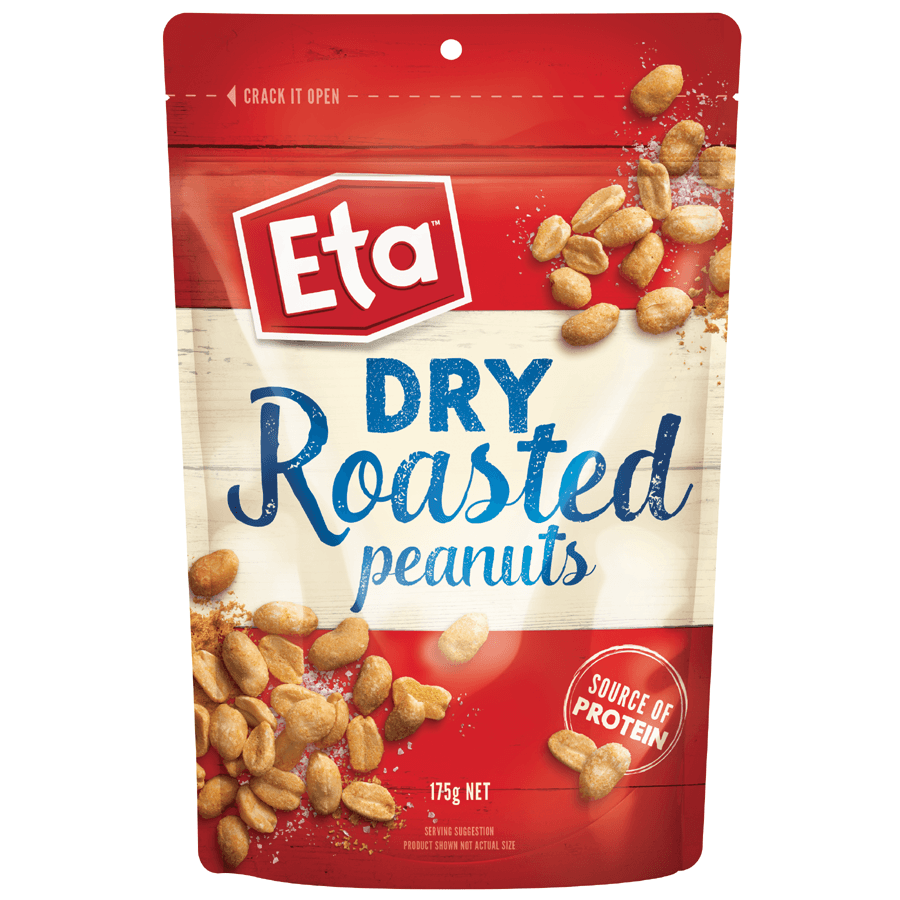 Eta Peanuts Dry Roasted - Are you nutty about ETA Nuts? ETA Nuts are quality nuts sourced and packaged into resealable pouches for your snacking pleasure. ETA nuts are irresistibly ETAble and now come in convenient snack packs so you can pop them into your lunch box or hand bag for a healthier snack on the go.
