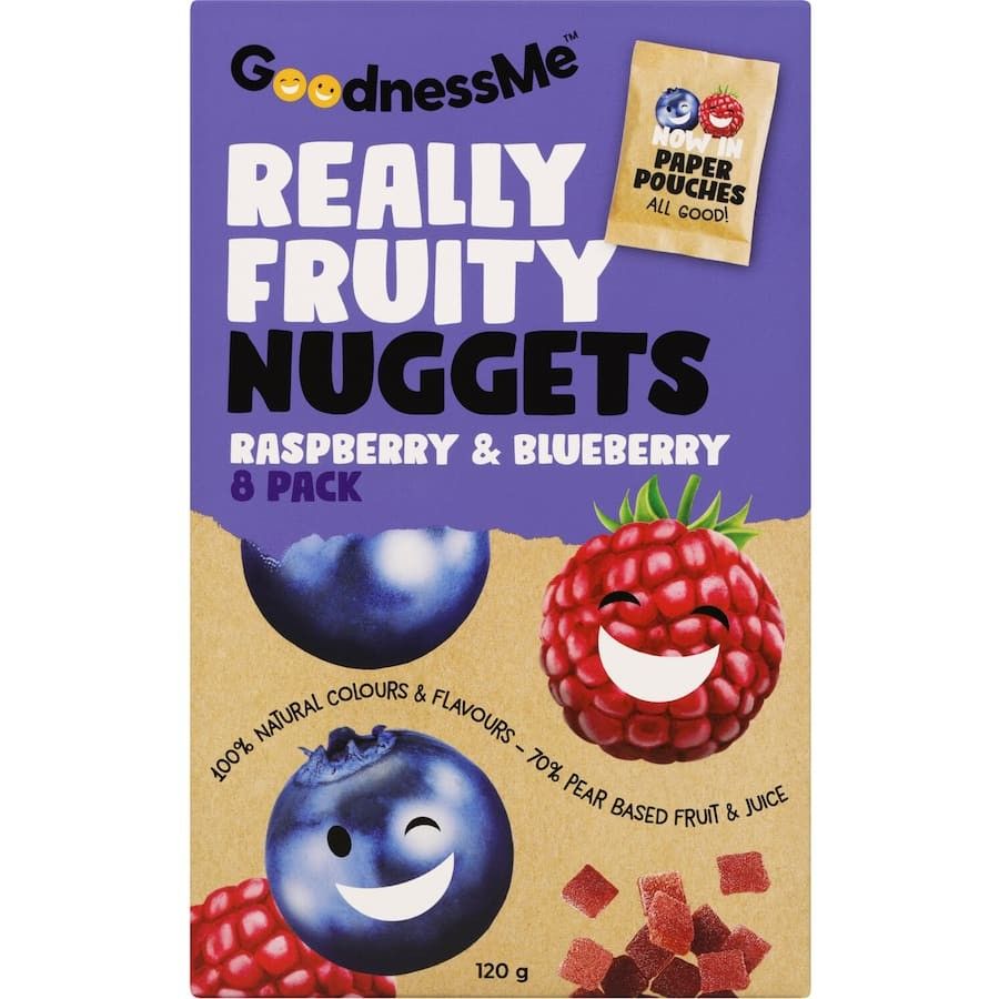 GoodnessMe Fruity Nuggets Raspberry & Blueberry - Good to go. GoodnessMe raspberry & blueberry really fruity nuggets are made with 70% fruit and juice! packed with 100% natural flavours and colours, these nuggets are bursting with fruity flavour.