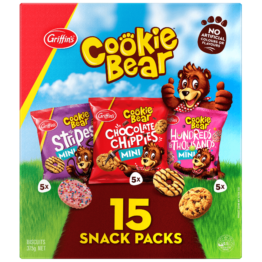 Griffins Cookie Bear Biscuits Snack Packs - 15 snack packs of mini Stripes, Chocolate Chippies and 100's and 1000's. Perfect for the kids lunch box.