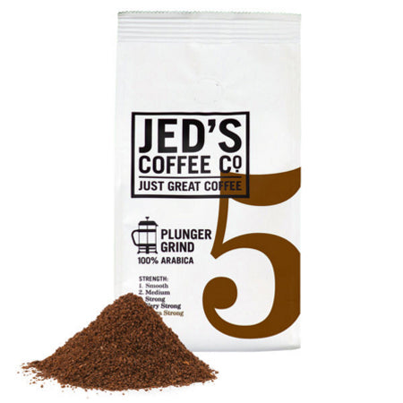 Jeds Coffee Co Plunger Grind 5 is a dark roast colour, with a flavour base of cocoa and liquorice notes. Ground to a medium fine texture, allowing water to circulate and unlock the full flavour.