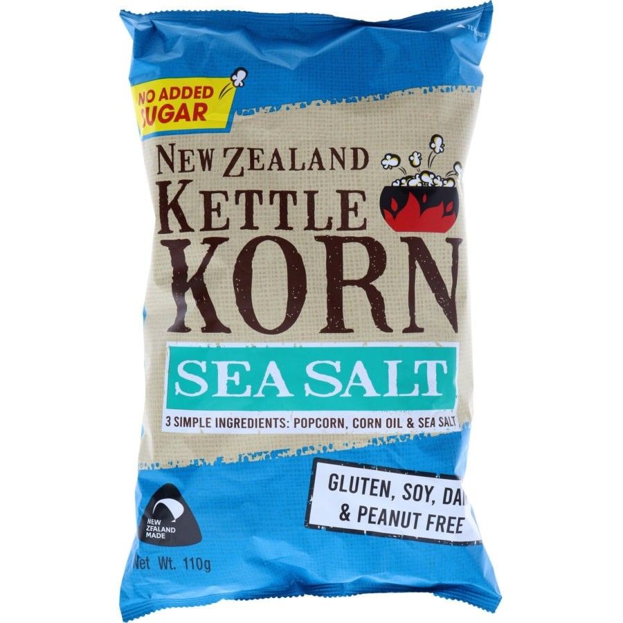NZ Kettle Korn Popcorn Sea Salt - 100% Kiwi made and proud of it! a full 110g of deliciousness are included in this bag. NZ kettle korn is gluten, soy, dairy and peanut free.