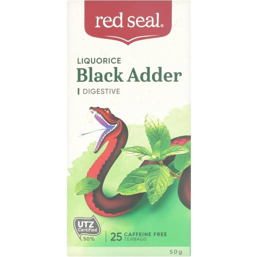 Red Seal Herbal Tea Black Adder 25 Pack - Packed with rich flavour this naturally sweet, caffeine-free tea contains a blend of liquorice, fennel and peppermint. Perfect for a soothing after dinner treat.