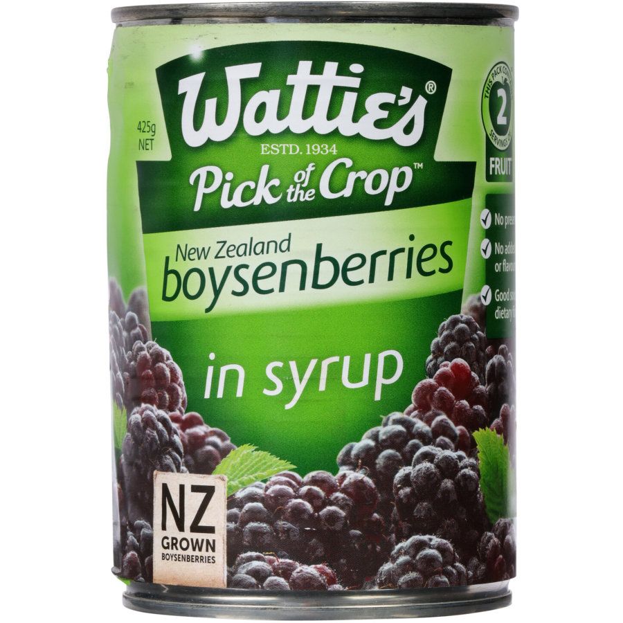 Wattie's Boysenberries In Syrup - Pick of the crop boysenberries in syrup are perfect for baking. Add to a baked apple pie or use as a topping on ice cream. Source of dietry fibre.